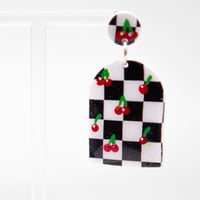 Arch-shaped earrings featuring a black and white checkerboard pattern with hand-painted cherry details.