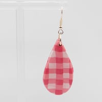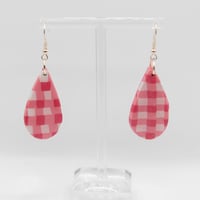 Teardrop-shaped earrings with a pink & white gingham pattern.