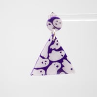 A purple triangle earring with a white ghost pattern on it.